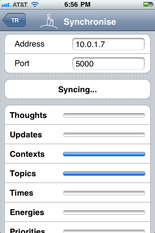 I have confirmed the IP numbers match--as I have always done. It looks like the iPone app is loading something as the bars for contexts, topics, and actions fill....